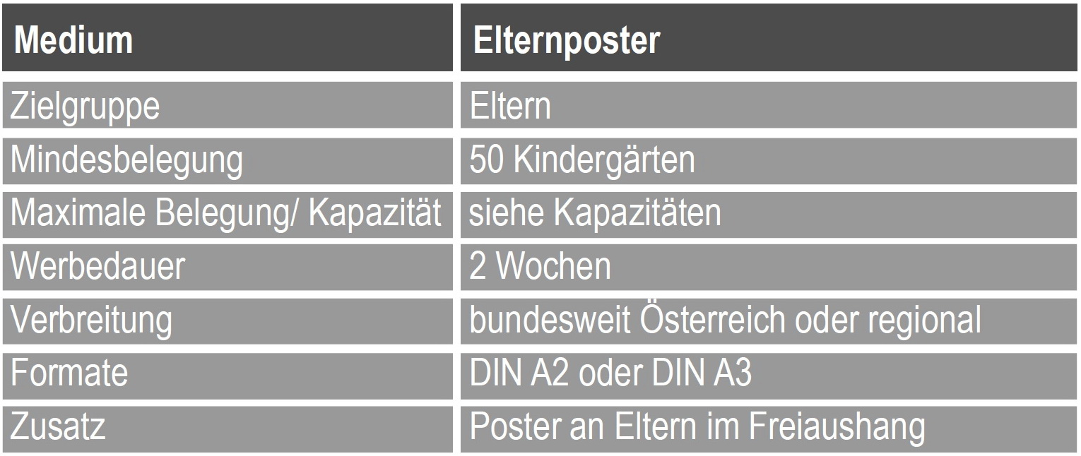 Mit den Elternposter werden in Kindergärten Eltern und Abholer angesprochen. Die Poster befinden sich im Eingangsbereich und sind in den Posterformaten DIN A3 und DIN A2 möglich. Die Elternposter richten sich an Eltern und Abholer der Kinder.