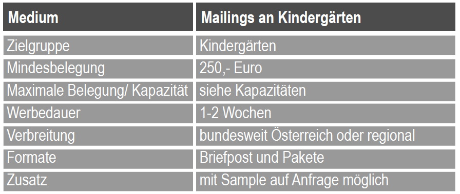 Mit Mailings per Post oder eMail können Sie über uns günstig alle deutschen Kindergärten erreichen. Maillings und Versandaktionen können wir zu alle deutschen Kindergärten und Verteiler anbieten. Sie können über uns alle Versandaktionen vom Standartbrief DIN Lang bis zum Großen Paket bis zu 31 Kilogramm an alle Bildungseinrichtungen versenden lassen. Es können natürlich auch Teilselektionen und weitere Selektionen vorgeben. Die Aussendungen können größtenteils auch neben dem Post- und Paketversand auch per eMail oder per Fax angeboten werden.