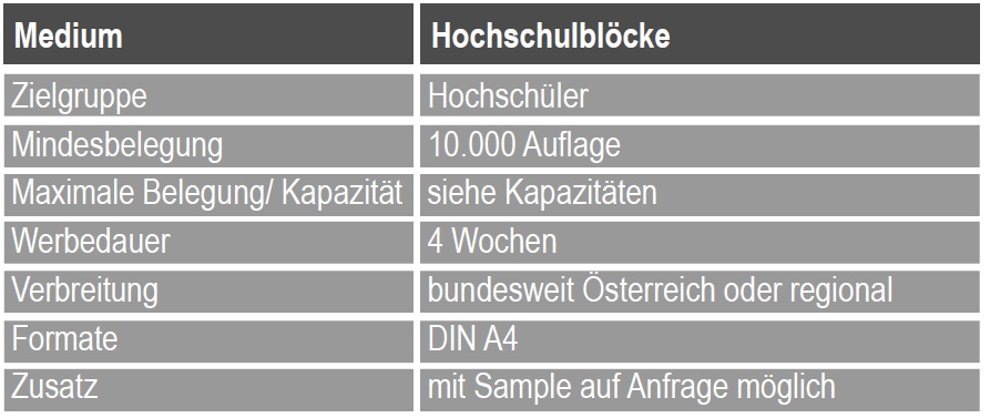 An Hochschulen kann über gebrandete Blöcke im Format DIN A4 geworben werden. Diese werden mit Zustimmung und Genehmigung der Hochschule an die Hochschüler verteilt. Die Titelseite und die Umschlagseiten U2 ist für Ihre vierfarbige Werbebotschaft zur freien Verfügung. Die Innenseiten enthalten die typischen Lineaturen in Grau. Die Mindestbelegung liegt bei 10.000 Blöcken mit der Verteilung an Hochschüler