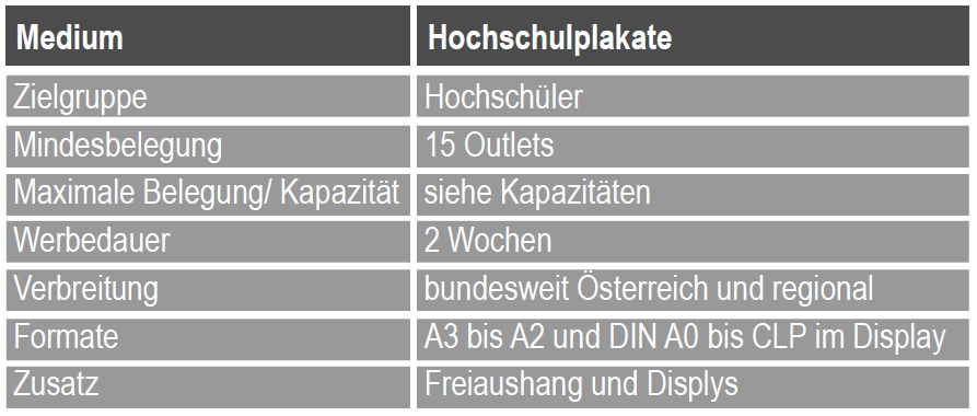 Plakate und Poster in Hochschulen und Universitäten bieten wir mit und ohne Displays (Alu-Wechselramen) in den Formaten DIN A4 bis DIN A0 an. Der Werbezeitraum beträgt jeweils 2 Wochen. Eine Buchung sollte aufgrund des hohen Auslastungsgrades möglichst 8 Wochen vor Kampagnenbeginn erfolgen