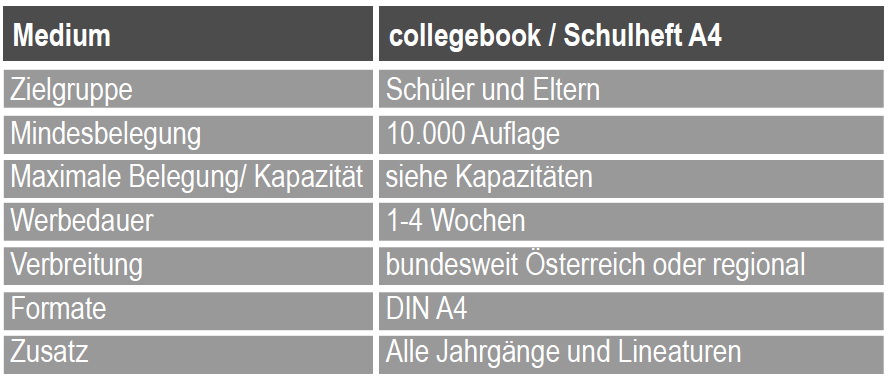 Das Konzept der gesponserten und mit Umschlagwerbung versehenen Schulhefte kommt aus England. Erste werbefinanzierte Schulhefte wurden dann auch 1999 aus Bottrop an deutsche Schulen versendet. Der Kunde kann Werbung auf den Umschlagseiten von Schulheften mit normaler Schullineatur belegen. Die Umschlagseiten kann der Kunde relativ frei von Vorgaben gestalten. Das Medium eignet sich auch gut in Kombination mit Samplings.