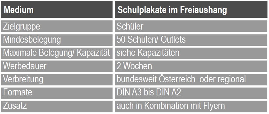 Es ist in Österreich üblich, dass Werbetreibende Poster in Schulen aufhängen, um Schüler zu erreichen. Zunächst definieren die Werbetreibenden ihre Zielgruppe, also welche Schüler sie erreichen möchten. Je nach Produkt oder Dienstleistung können sie zum Beispiel bestimmte Altersgruppen oder Schulformen anvisieren. Anschließend gestalten sie ein Poster mit einem ansprechenden Design und einer klaren Botschaft. Das Poster soll auf den ersten Blick auffallen und das Interesse der Schüler wecken. Die Poster werden meist an gut sichtbare Standorte, wie etwa Eingangsbereiche, Flure oder Pausenräume platziert. Wir Schulposter in den Formaten DIN A3 und DIN A2 im Freiaushang in allen Schularten an.
