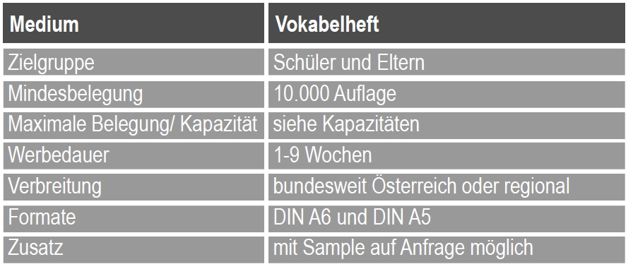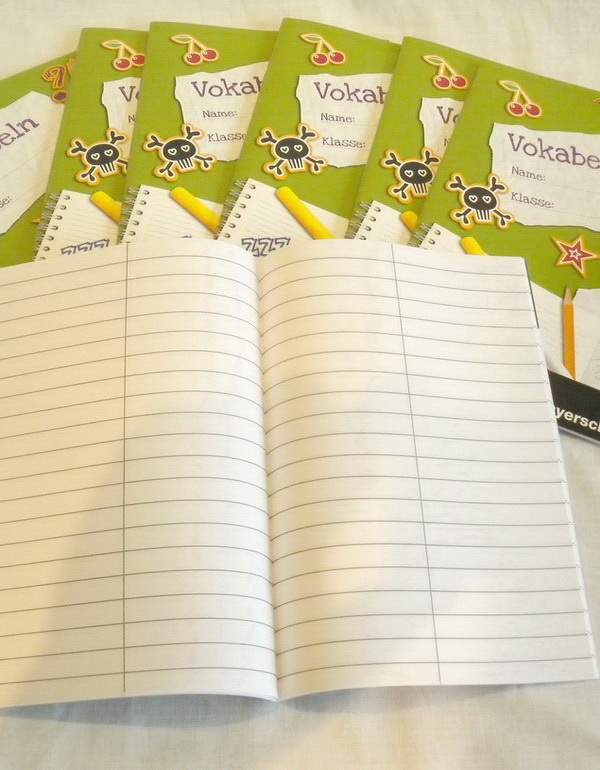 Zu dem umfassenden Angebot an Schulheften gehören natürlich auch Vokabelhefte. Diese Hefte sind preisgünstig und bieten sich für allen Schultypen an. Der Kunde alle 4 Umschlagseiten belegen, das Verbreitungsgebiet und den Erscheinungstermin bestimmen.